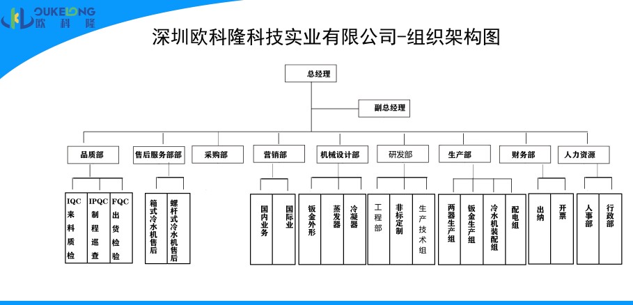 歐科隆制冷總經(jīng)理辦公室下轄九大部門,分別為:品質(zhì)部、售后服務(wù)部、采購部、營銷部、機(jī)械設(shè)計部、研發(fā)部、生產(chǎn)部、財務(wù)部、人力資源部。最高行政權(quán)、人事任免權(quán)為總經(jīng)理所有??偨?jīng)理下轄:銷售副總經(jīng)理,副總經(jīng)理。