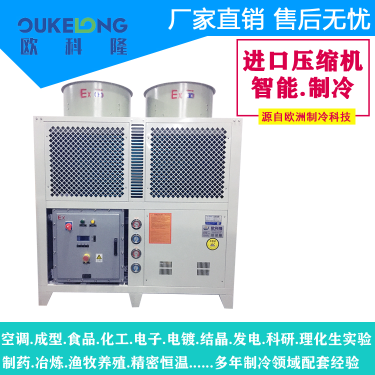 歐科隆15匹防爆冷水機專為化工、制藥、鋰電池等易燃易爆環(huán)境研發(fā),通過國家Ex dⅡBT4防爆認(rèn)證,整機采用防爆壓縮機、防爆電控系統(tǒng)及無火花元件,確保危險場所安全運行,為關(guān)鍵生產(chǎn)流程提供可靠制冷保障。